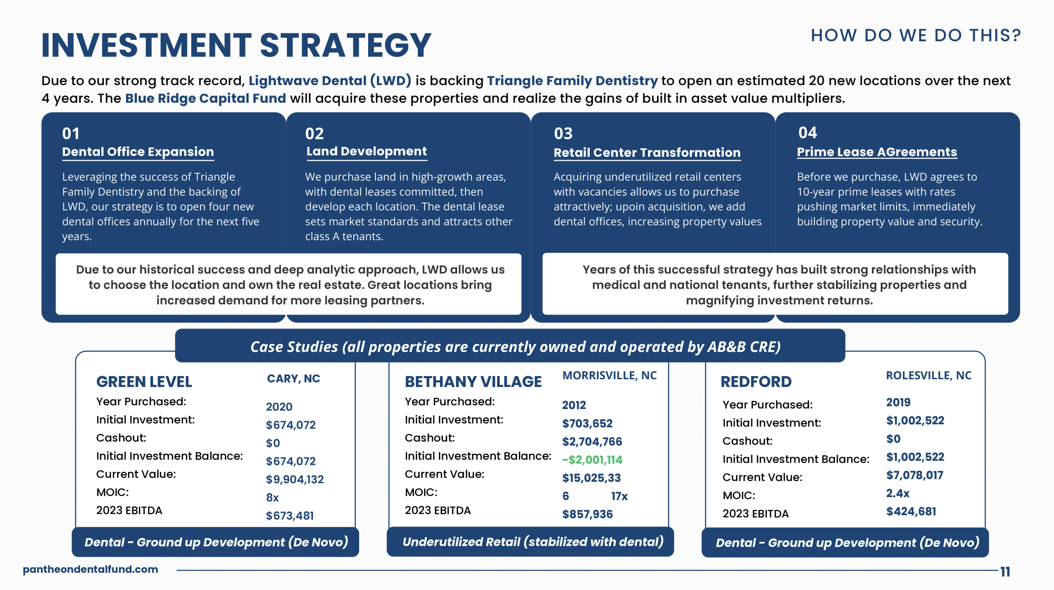 - Healthcare's Built-In Resilience: While many commercial real estate sectors face uncertainty from changing consumer habits or economic cycles, dental services remain consistently essential. Our properties benefit from a unique combination of factors: high-credit healthcare tenants, long-term triple-net leases, and strategic locations in growing markets. This creates multiple layers of protection for your investment while positioning it for growth.