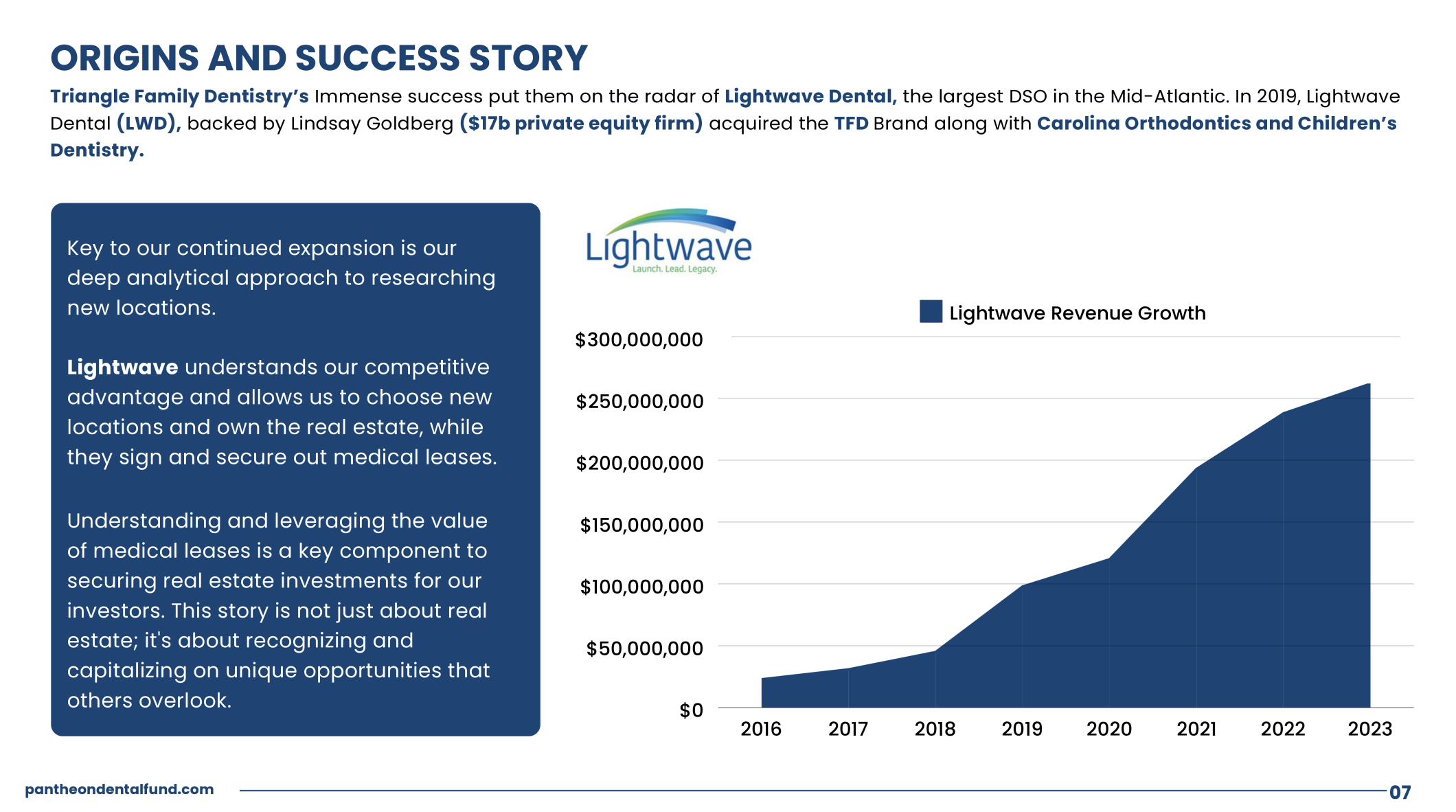 - Institutional-Quality Income: Dental practices are more than just tenants—they're established healthcare providers who sign long-term leases and invest heavily in their locations. Our 8% preferred return is backed by practices that typically stay in place for decades, creating the kind of reliable income stream that sophisticated investors demand. This stable foundation supports consistent quarterly distributions while maintaining strong potential for appreciation.